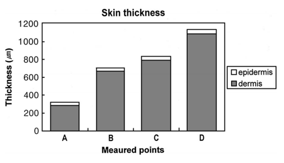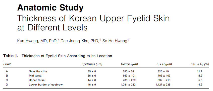 저널에 의하면 속눈썹 주변, 검판 가운데, 검판 위, 눈썹 아래로 가면 갈 수록 표피의 두께는 큰 변화 없고, 진피의 두께는 유의미하게 두꺼워 지고 있습니다.