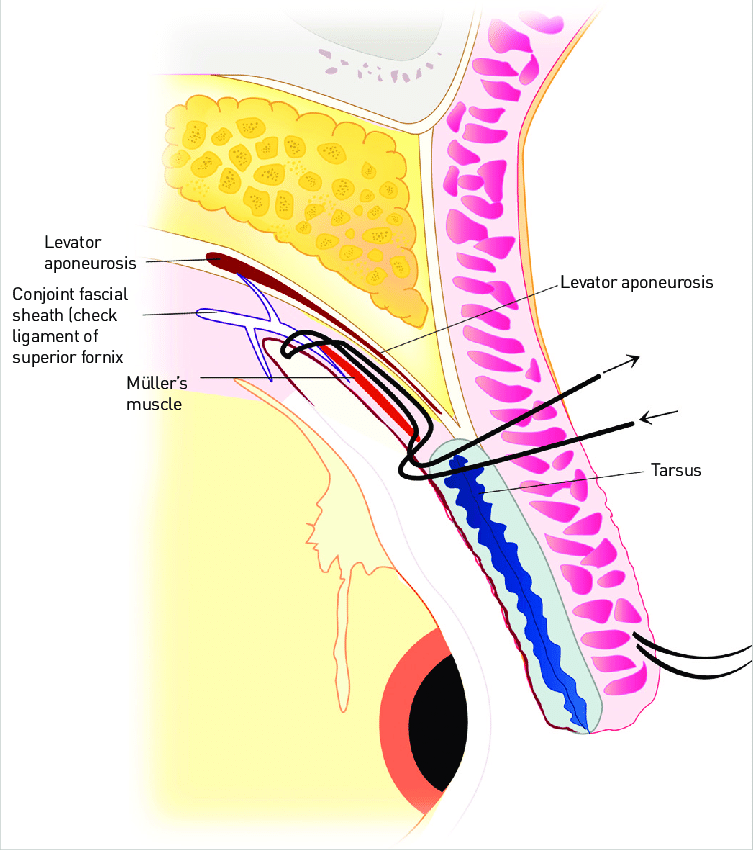 오른쪽과 같이 뮬러근을 독립적으로 접는 수술을 뮬러근 주름술 이라고 하고, 경도의 안검하수가 있는 환자들에게 사용 할 수 있는 방법입니다.
