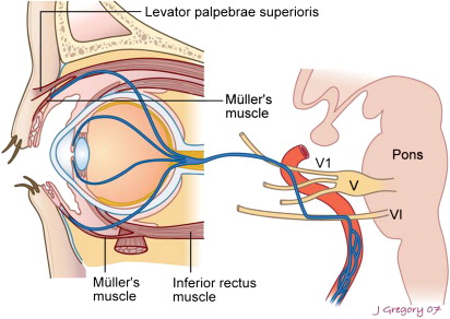 교감 신경계란 자율신경계로 무의식적으로 작용하게 됩니다. 갑자기 놀랐을 때 눈이 커지고 동공이 열리는 것은 바로 이 교감신경계가 작용해서 그런 것이지요. 우리가 눈을 무의식적으로 뜨고 감는 것과 상안검의 미세한 움직임을 결정하는 근육은 바로 이 뮬러근 입니다.