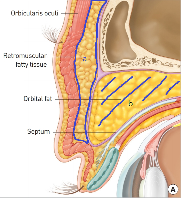 a.는 앞의 안륜근(Orbicularis oculi) 뒤에 있는 지방이라고 해서 근육 뒤 지방 정도로 부르고, 양이 매우 적습니다.